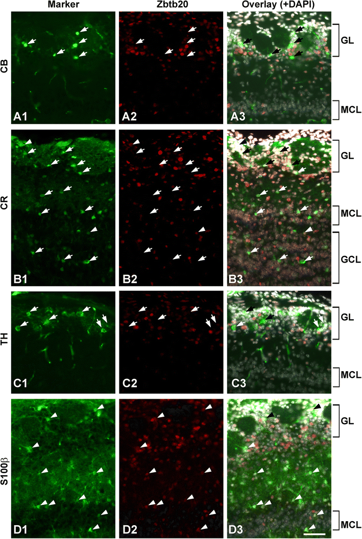 Post-natal expression of Zbtb20 in neurons and astrocytes of the olfactory bulb (OB) at stage P12. A1–A3 Co-immunostaining with anti-calbindin (CB; arrows) and anti-Zbtb20 antibodies does not show co-labeling. B1–B3 Co-immunostaining for calretinin (CR) and Zbtb20 revealed that most CR+ cells (arrows) do not co-express Zbtb20. C1–C3 Co-staining between tyrosine hydroxylase (TH; arrows) and Zbtb20 does not show co-labeling as well. D1–D3 Co-staining between the astrocytic marker S100β and Zbtb20 demonstrates co-labeling for many cells (arrowheads). Scale bar: 50 μm