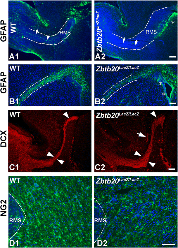Because of the early post-natal mortality of Zbtb20 lacZ/lacZ mice, we could not investigate the effect of Zbtb20 LOF on adult neurogenesis. The performed analysis of the early post-natal (P4) SVZ/RMS revealed in the mutant a greatly thickened RMS with a strongly reduced GFAP expression (Fig. 6A1–B2, dotted lines) and an accumulation of GFAP+ cells in the SVZ (Fig. 6A1–B2, asterisks). The thickening of RMS was still visible at P12 as depicted by DCX immunostaining (Fig. 6C1–C2, arrowheads), which also revealed clusters of DCX+ cells in the mutant subcortical WM adjacent to RMS (Fig. 6C2, arrow). Furthermore, we found a decreased immunoreactivity for the oligodendrocyte progenitor marker NG2 in the subcerebral white matter adjacent to RMS (Fig. 6D1–D2) and in the Olig2+ cells in the corpus callosum (WT: 30 ± 2 cells/frame, Zbtb20 KO: 20 ± 2 cells/frame 100 × 100 μm). Together, these results indicate a reduced gliogenesis in Zbtb20 lacZ/lacZ mice soon after the switch between neurogenesis and gliogenesis, suggesting an involvement of Zbtb20 in this process.