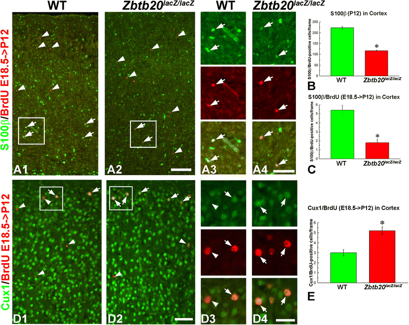 Diminished presentation of E18.5-born astrocytes in the neocortex of Zbtb20lacZ/lacZ mice. Pregnant mice were injected with BrdU at the embryo stage E18.5, and analysis was performed at P12. A1–A4 Dual staining for S100β (green) and BrdU (red) shows reduction of total S100β+ cells in the cortex as well as a reduction of the E18.5-born S100β+ cell population. Statistical evaluation of the data is presented in panels B and C with asterisks indicating statistical significance (p < 0.05). Frames in A1 and A2 correspond to the magnified images of A3 and A4, respectively. D1–D4 Enhanced generation of E18.5-born upper layer neurons positive for Cux1. Dual staining for Cux1 (green) and BrdU (red) shows increase of BrdU+/Cux1+ cells in the uppermost neocortical layers (arrows). Statistical evaluation of the data is presented in panel E with asterisks indicating statistical significance (p < 0.05). Arrowheads depict BrdU+/Cux1− cells, typically in deep position. Frames in D1 and D2 correspond to the magnified images of D3 and D4, respectively. Scale bars: A2/D2, 100 μm; A4/D4, 50 μm
