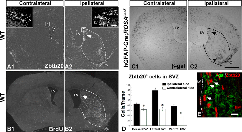 Thus far, we have established that Zbtb20 is expressed by post-natal SVZ progenitors including the NSC fraction and that its levels affect the normal developmental genesis of glial populations, in particular astrocytes. The astrocyte response to injury, known as reactive gliosis, is highly prevalent after brain damage but is still poorly understood. Given the potential of Zbtb20 to affect astrocytic levels under normal conditions, we addressed its role under conditions of injury using an experimental stroke model [32]. The application of this model inflicts damage on the ipsilateral striatum and cortex of adult mice. After stroke in WT mice, we found a significant increase in the number of Zbtb20+ cells along the ipsilateral SVZ as compared to the contralateral SVZ (Fig. 8A1–A2; insets). Statistical analysis confirmed the significance of this upregulation in the dorsal, lateral, and ventral SVZ (Fig. 8D). Notably, there was a marked increase of the Zbtb20+ cells also in the infarct area (Fig. 8A2; dotted lines) and the ipsilateral pyriform cortex (Fig. 8A2). To study cell proliferation after stroke, we continuously injected BrdU in the operated mice for 10 days starting at day 8 after stroke and sacrificed the animals on day 28 after stroke. We detected a prominent increase of BrdU+ cells in the ipsilateral hemisphere (Fig. 8B1–B2), which paralleled the post-ischemic increase of Zbtb20+ cells in the SVZ (Fig. 8B2; arrow) and the infarct area (Fig. 8B2; dotted lines).